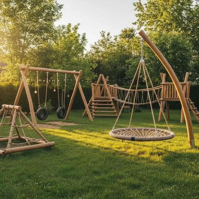 Новая площадка будет принципиально отличаться от стандартных игровых комплексов. Здесь не будет яркого пластика, металлических конструкций и громких аттракционов. Основной материал — натуральное дерево: массивные брёвна, спилы деревьев, пни разной высоты. Конструкция напомнит мини-полосу препятствий. Дети смогут переходить по круглым спилам, балансировать на брёвнах, проходить маршрут, не касаясь земли. Покрытие — естественный травяной настил.